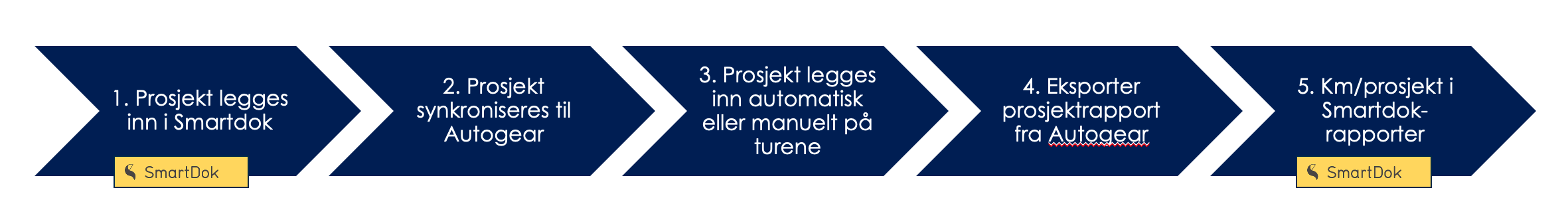 Ved å aktivere integrasjonen vil Autogear automatisk hente inn alle dine Smartdok-prosjekt. Når kjøreturene treffer adresser som er knyttet til disse projektene, vil Autogear automatisk legge til prosjekt på turene. Rapporter kan tas ut i Autogear, eller man kan synkronisere tallene over til Rapport-modulen i Smartdok.